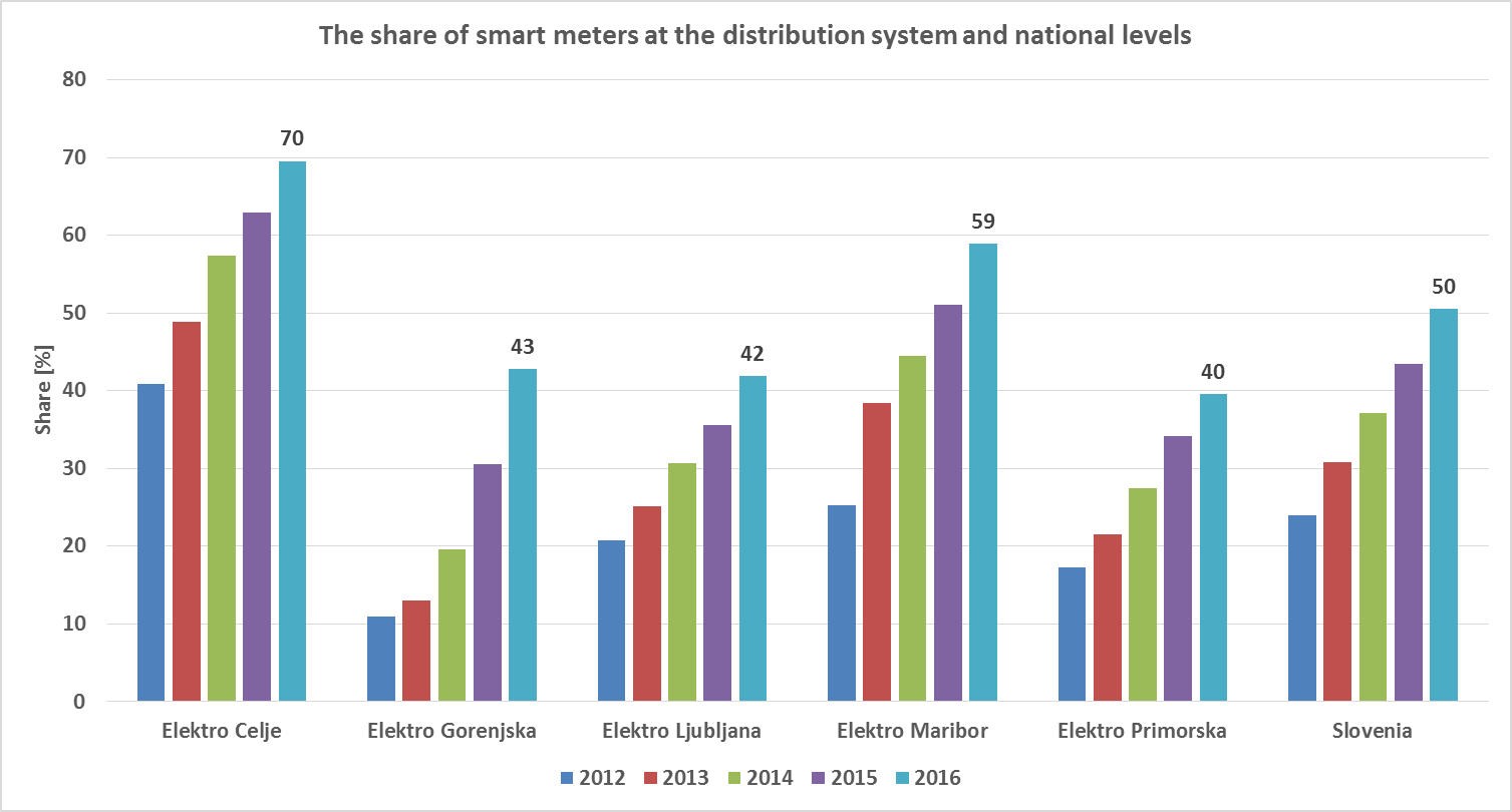 The share of smart (electricity) meters by individual electricity distribution areas and for (the entire) Slovenia is shown in the picture attached below.